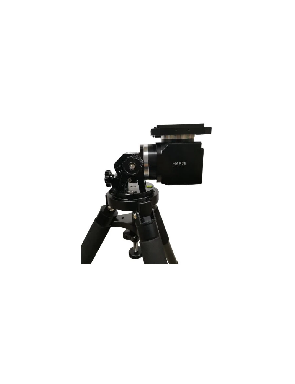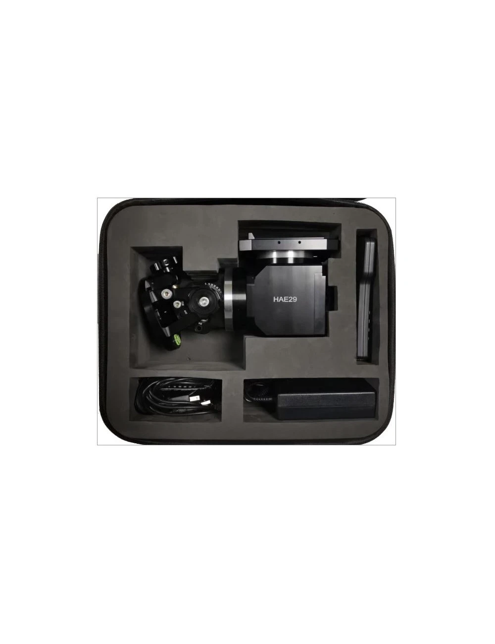 IOptron présente avec l’HAE29 sa nouvelle génération de montures harmoniques pouvant fonctionner soit en mode équatorial soit en mode alt-azimutal. Cette gamme est destinée à un usage nomade pour une utilisation aussi bien visuelle qu’à des fins d’imagerie. Elle se distingue de suite par son petit format, sa légèreté (3,7 kg) au regard de sa capacité de charge (13,5 kg) sans faire appel à un contrepoids. Le format d’accueil du matériel supporté est double : Vixen/Synta et Losmandy/CGE. Cette prouesse est possible grâce à l’utilisation de réducteurs elliptiques et de courroies synchrones (engrenage à onde de déformation). Cette technologie est directement importée avec succès du monde de la robotique et de l’aviation. La raquette de commande iOptron Go2Nova, ergonomique et facile à appréhender est livrée dans la configuration de base mais la plupart des astronomes amateurs préféreront également un contrôle direct en ASCOM (en utilisant le logiciel iOptron Commander) dans le cas d’une connexion PC/Windows, via INDI pour MacOS, ou encore avec un Smartphone ou une tablette (avec iOptron Commander Lite ou une appli comme SkySafari) ou encore un Rasberry Pi. Comme toutes les autres montures iOptron, les moteurs sont silencieux et consomment peu. Cette monture est livrée sans trépied ; iOptron propose donc ses nouveaux trépieds 21″ en fibre de carbone, stables, légers, rigides ou le traditionnel LiteRoc. Base de données de plus de 212 000 objets et Wi-Fi intégrés. Il s’agit de la version « classique » HAE29 sans viseur polaire optique, concurrente directe de la ZWO AM5.