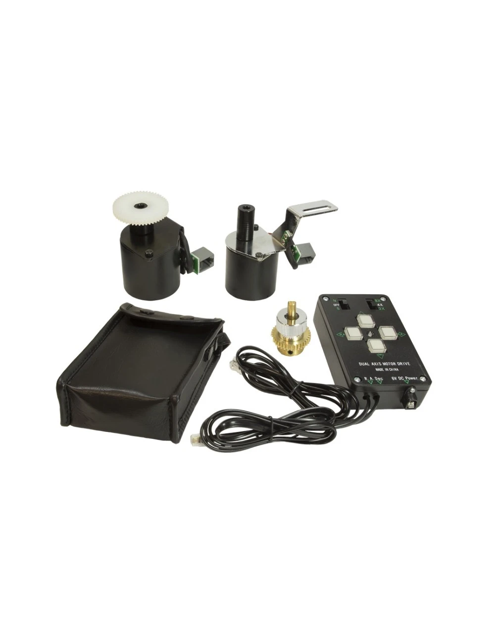 Cet ensemble d’asservissement double axe est composé d’un moteur d’entrainement en ascension droite, d’un moteur d’entrainement en déclinaison, d’une raquette de contrôle avec oscillateur à quartz et d’un boitier d’alimentation par piles.
