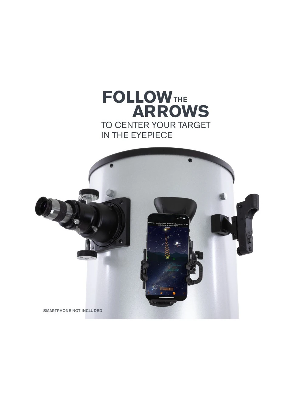 Après avoir aligné votre téléphone sur l’optique du télescope (une procédure simple et rapide), StarSense Explorer génère une liste des objets célestes actuellement visibles. Faites votre sélection et des flèches apparaissent à l’écran, vous guidant lorsque vous déplacez le télescope. Lorsque l’objet est prêt à être visualisé dans l’oculaire, la cible devient verte.