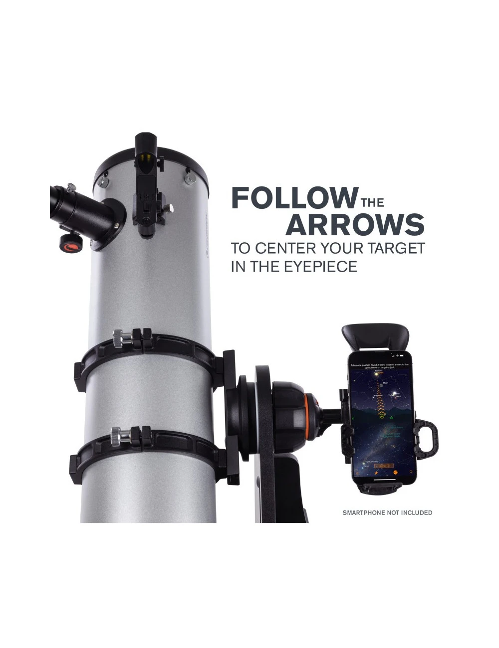 Après avoir aligné votre téléphone sur l’optique du télescope (une procédure simple et rapide), StarSense Explorer génère une liste des objets célestes actuellement visibles. Faites votre sélection et des flèches apparaissent à l’écran, vous guidant lorsque vous déplacez le télescope. Lorsque l’objet est prêt à être visualisé dans l’oculaire, la cible devient verte.