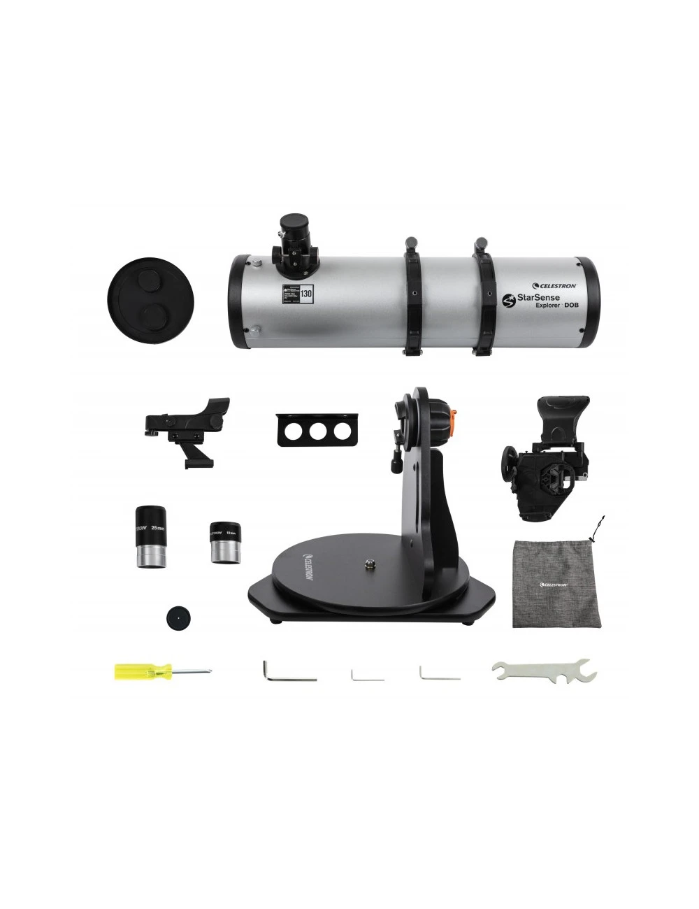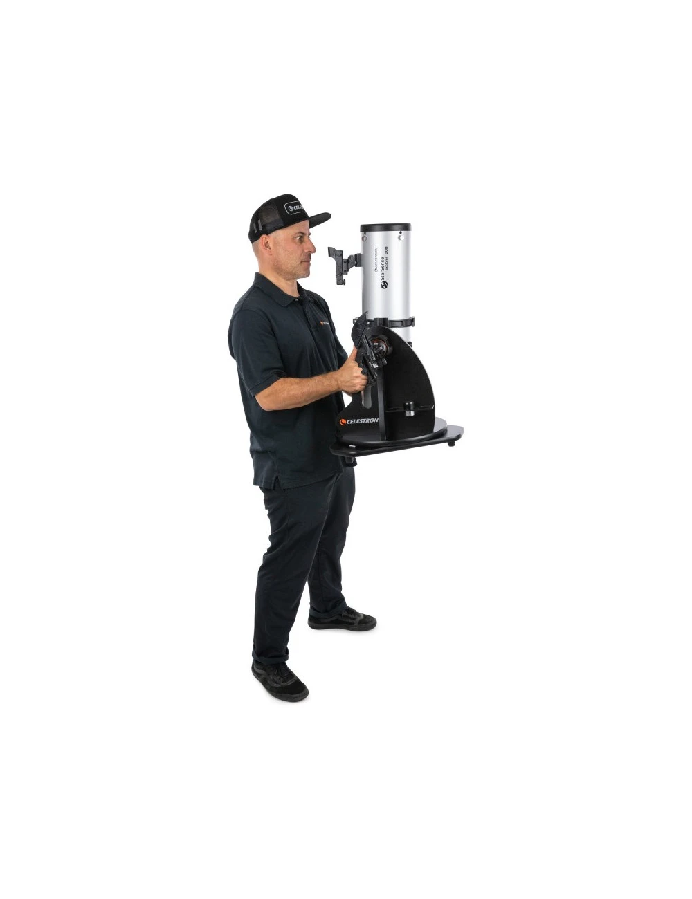 Le transport de votre Dobson StarSense Explorer est facile grâce aux poignées de transport ergonomiques situées au point d’équilibre du tube et de la base. Des caches anti-poussière sont également inclus pour l’avant du tube et le porte-oculaire.