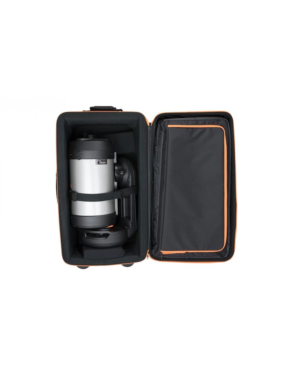 L’intérieur de la mallette comprend deux calages en mousse dense amovibles et une sangle de compression intégrée conçue pour bien adapter le maintien de chaque modèle de télescope. Des roues et une poignée télescopique facilitent le transport. Tous les côtés sont rembourrées ainsi que le dessus de la poche pour accessoires. Le portage est assuré par trois poignées de transport. Deux sur le dessus et une en tissu sur le côté gauche.